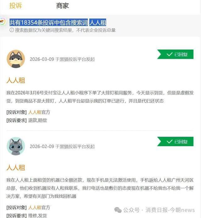 虽然此前人人租发布整改声明并展开了一系列整改动作,但截至2026年3月10日,在黑猫投诉平台,以“人人租”为关键词可检索到累计超过1.8万条投诉。