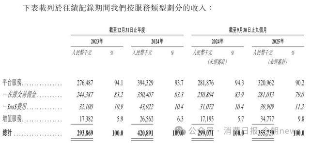 以最近的2025年前九个月财务数据为例,公司在线交易佣金收入2.81亿元,占比高达79.0%(向商家收取每单交易额5%-20%);SaaS服务费收入0.40亿元,占比为11.2%(商家年费9800-19800元/首年,续期6800-9800元/年);增值服务收入0.35亿元,占比为9.8%(为入驻商家提供採购及物流支持服务等)。
