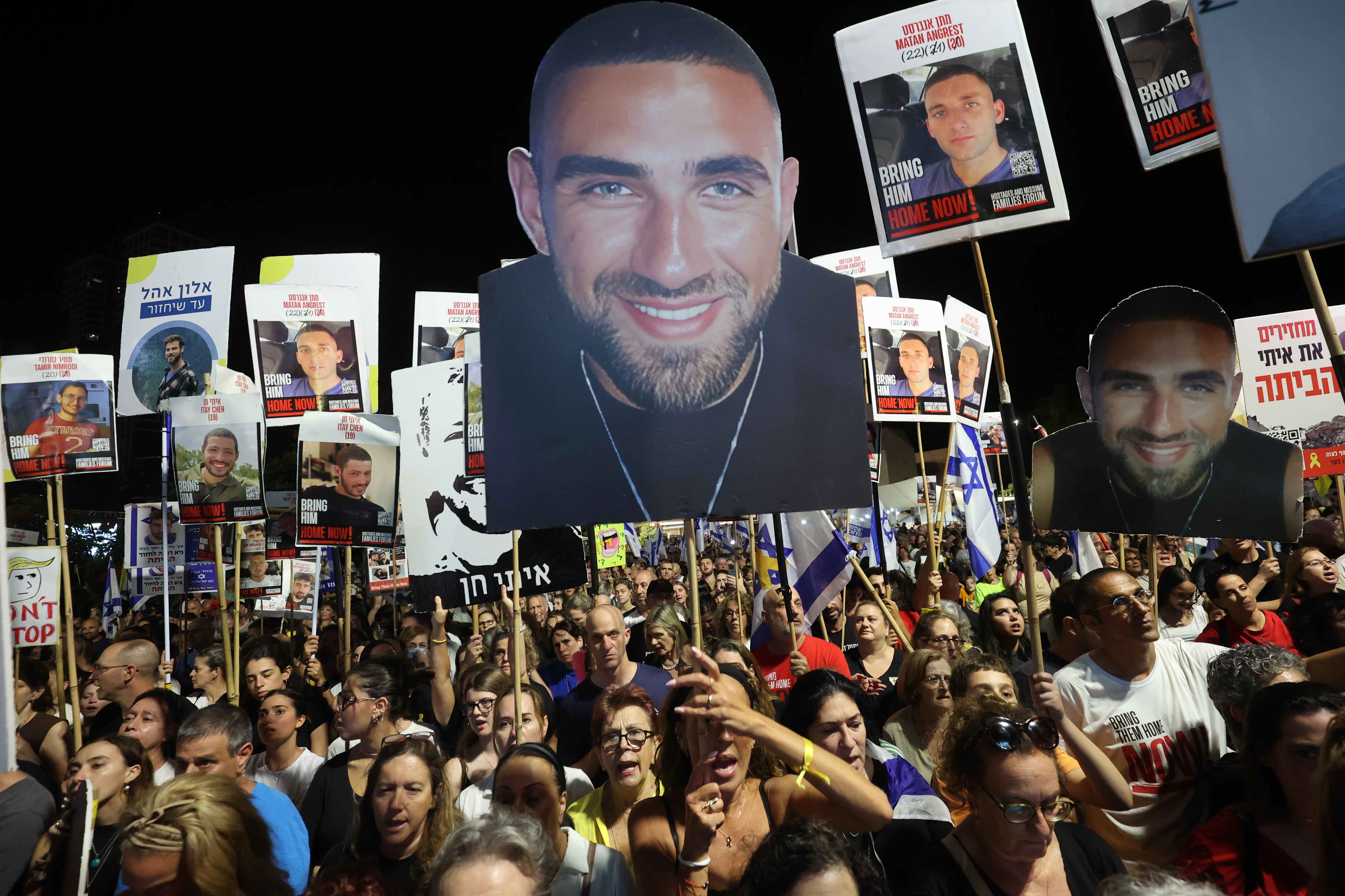 10月4日,被扣押人员家属和支持停战的人们在以色列特拉维夫举行游行集会,要求政府迅速在加沙地带实现停火,让被扣押人员回家。新华社发(吉尔·科恩·马根摄)