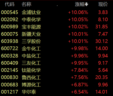 具体来看,化学原料板块走高,金浦钛业、中泰化学、宝丰能源、三孚股份等多股涨停。