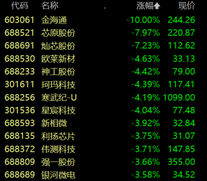 半导体板块走低,金海通跌停,芯原股份、灿芯股份跌超7%,欧莱新材、神工股份跌超4%。