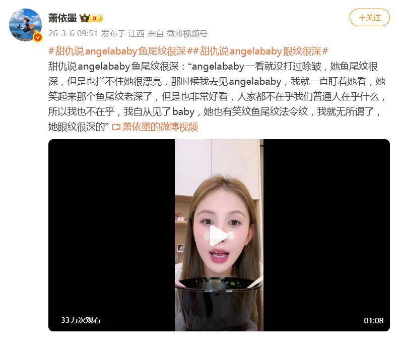 直播中,甜仇绘声绘色地还原了见到本尊的场景:“那时候我去见Angelababy,我就一直盯着她看,她笑起来那个鱼尾纹老深了,但是也非常好看。”她不仅提到了鱼尾纹,还点出了眼纹和法令纹,但结论却一反常态——正是这些“瑕疵”,让她觉得Baby美得更真实,甚至因此治愈了自己的焦虑:“人家都不在乎我们普通人在乎什么?所以我也不在乎了。”